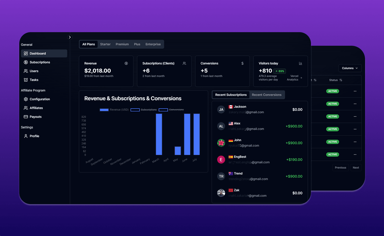Automatically updated key statistics and data for each plan, including revenue, subscriptions, users, conversions, affiliates, visitors, and more.