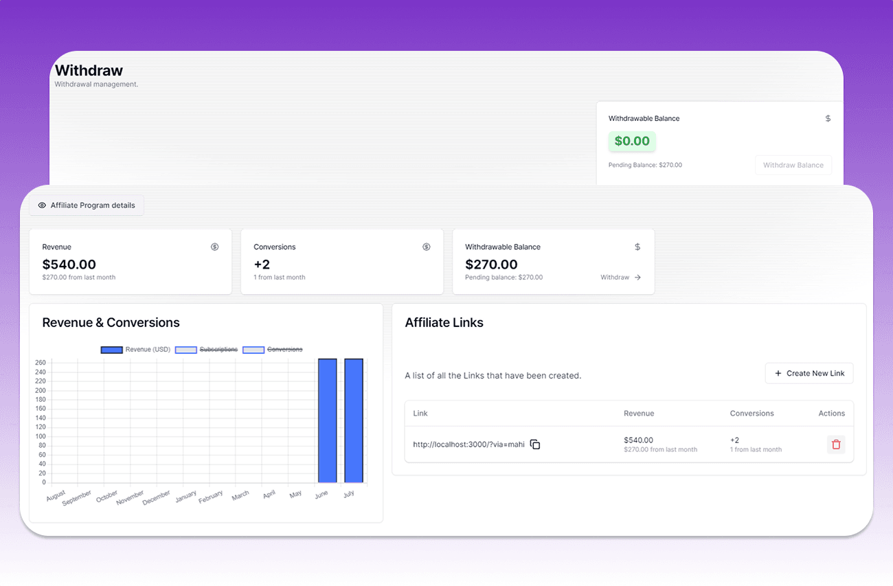Customize the affiliate program with options to select plans, choose reward types, set payout thresholds, define referral cookie durations, and more.