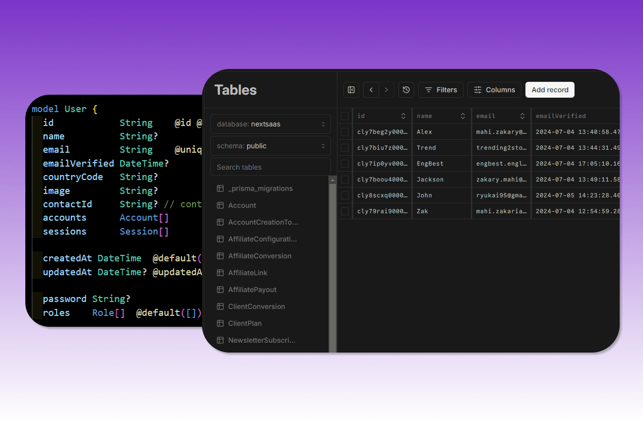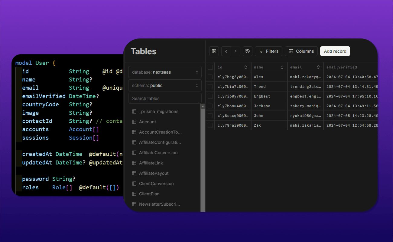 Use your preferred database effortlessly with Prisma ORM, the preferred choice for modern database management. Built with PostgreSQL by default, with support for Neon, Supabase, or self-hosted solutions.