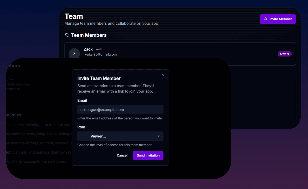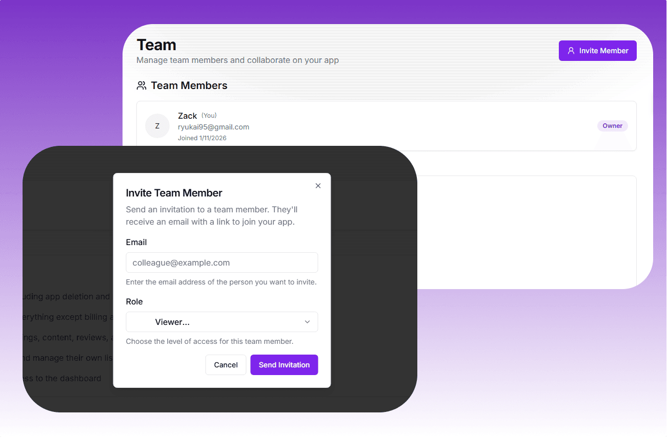 Enable your app users to build collaborative teams and manage permissions effectively. Users can invite members to their created applications with granular role-based access control, fostering teamwork and efficient app management.