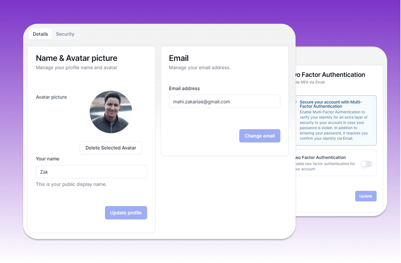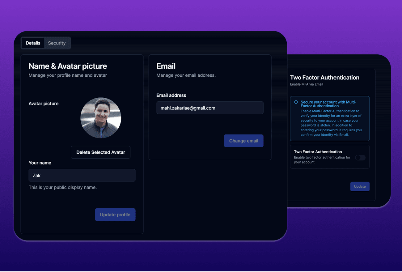 Members of user-created applications receive their own personalized authentication system and comprehensive dashboard. Each member gets secure access to manage their profile, billing, notifications, and account security within the context of their assigned app.