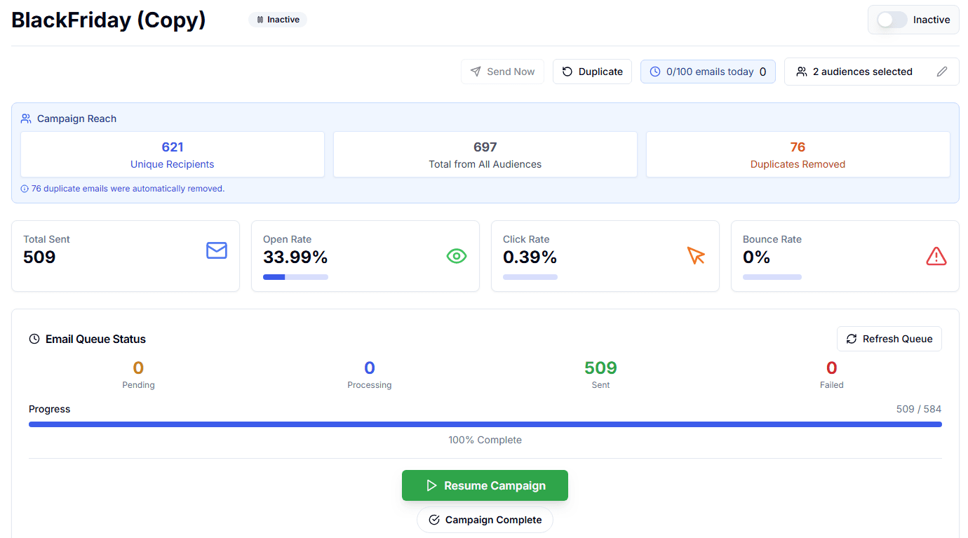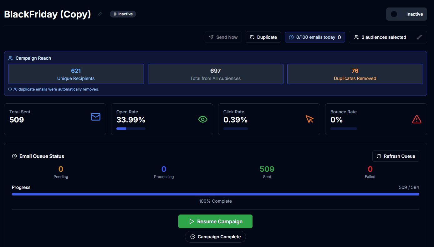 Comprehensive performance metrics: Open Rate, Click Rate, Conversion Rate, Bounce Rate, and Unsubscribe Rate tracking